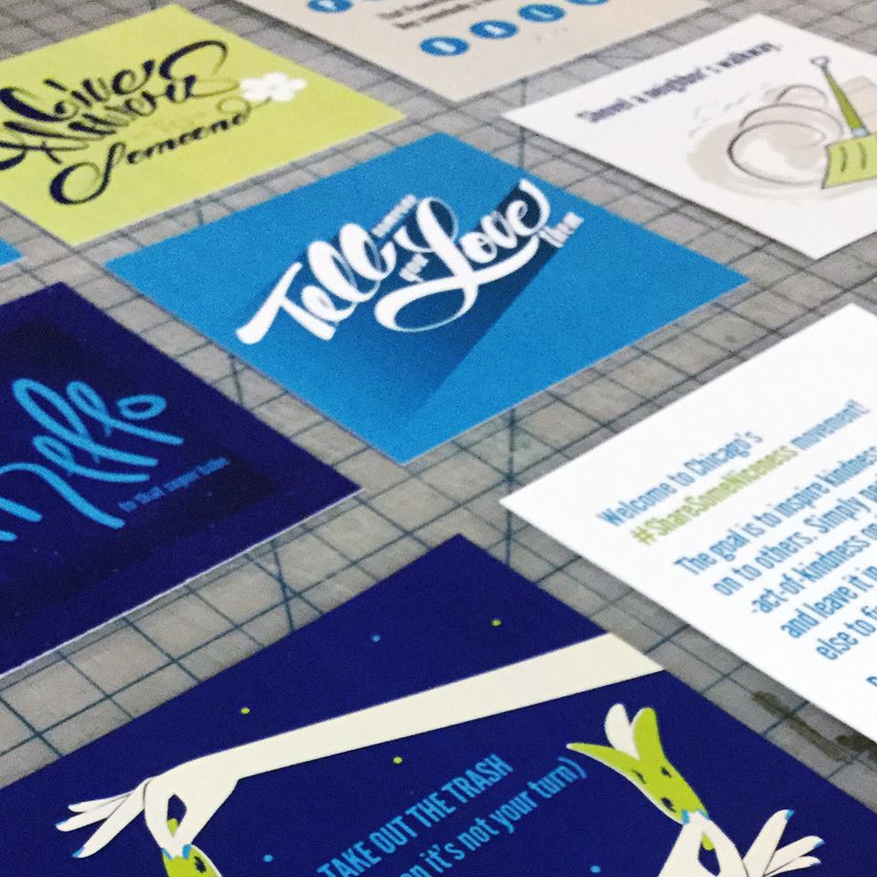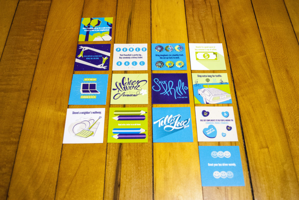 These are my contribution to a small deck of cards with illustrated random acts of kindness. The goal of this project was to have people see the cards and perform one of the random acts of kindness from the card. Once the task is completed they then pass along the card to whomever they showed kindness to so they can show some kindness to another person.